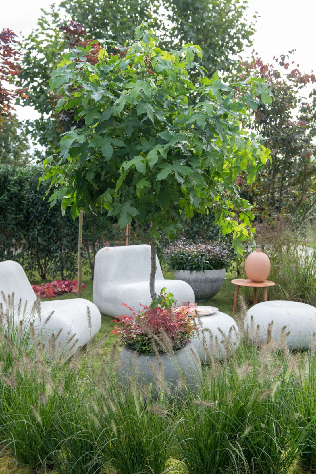 Voor veel mensen kunnen klimaatverandering en artificial intelligence bedreigend aanvoelen. Als antwoord hierop willen we een tuin die een veilig gevoel en bekend beeld oproept. Je wilt jezelf omarmd weten, afgeronde en organische vormen versterken dit. Een warm kleurenpalet van lichte en donkere tinten intensiveren de zachte uitstraling waardoor iedereen zich extra op zijn gemak voelt. Een belangrijke accentkleur is roze. In de Zachte Veilige Tuin vormen gras, slingerende borders en afgeronde meubelen een uitnodigend geheel. De planten zijn huidkleurig zoals purperklokje (Heuchera) en zijn beweeglijk en transparant als siergrassen. Rijkbloeiende hortensia’s (Hydrangea) zorgen voor kleuraccenten. De ronde potten geven het geheel een huiselijke uitstraling.